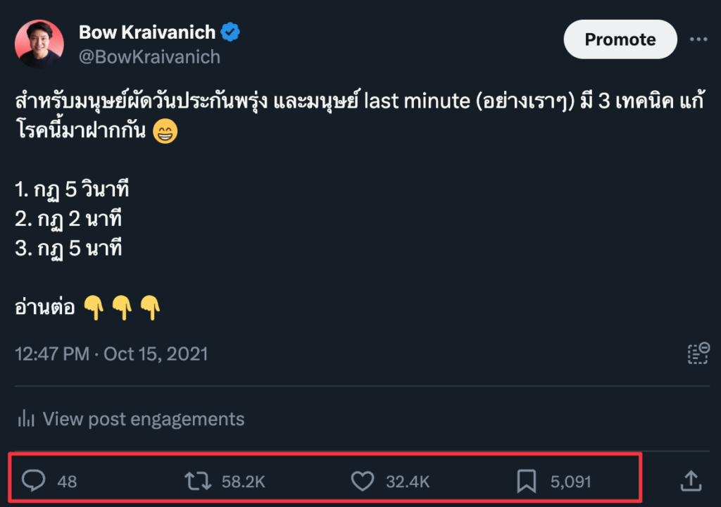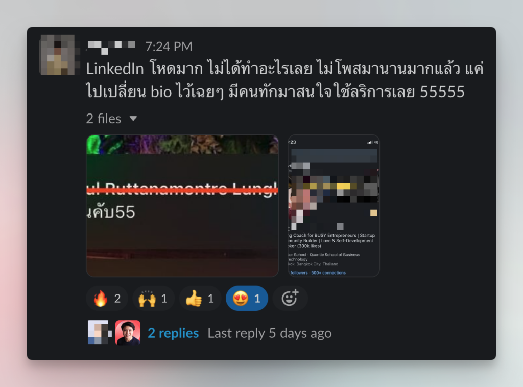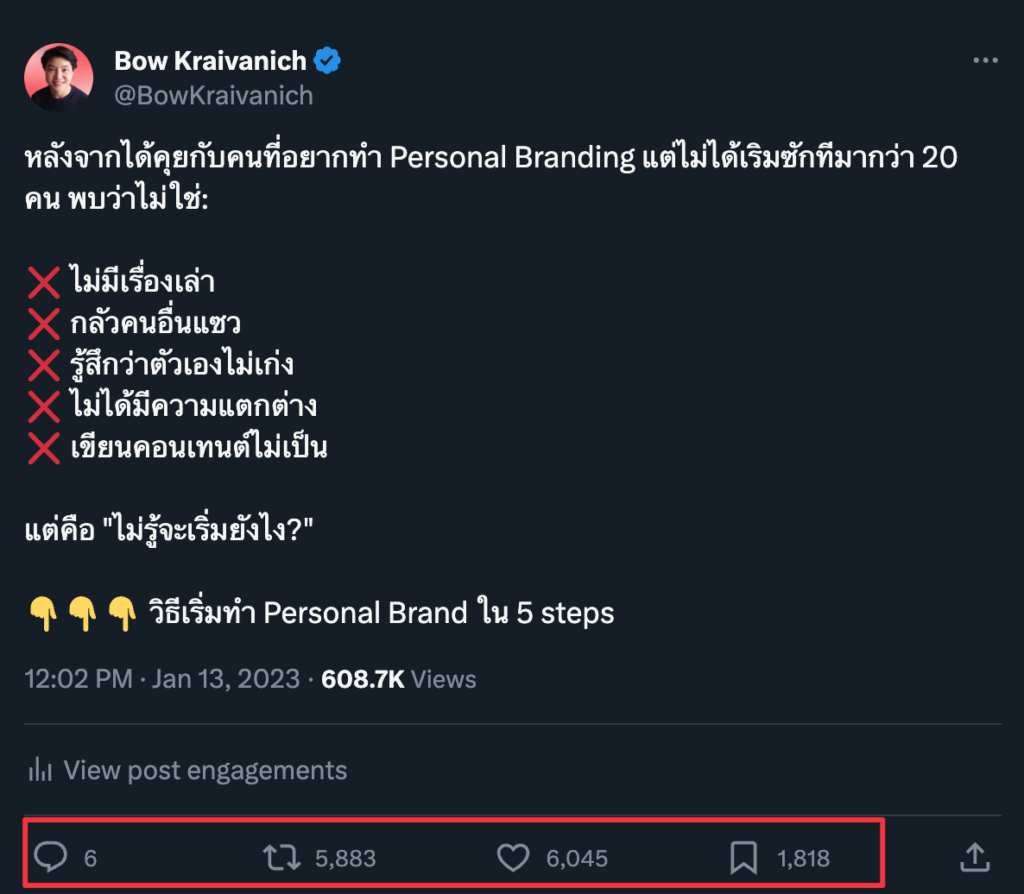 อดีตผู้ร่วมก่อตั้งและพาร์ทเนอร์ บริษัท Magnetolabs และ Content Shifu สนใจทำ Personal Branding มากกว่า 10 ปี แต่ก็เหมือนคนทำธุรกิจส่วนใหญ่ที่ไม่มีเวลามาโฟกัส เลยไม่ได้ทำสม่ำเสมอ จึงไม่เห็นผลลัพธ์ จนกระทั่งเริ่มลงมือทำจริงจัง ภายใน 6 เดือน ก็สามารถสร้างผู้ติดตามรวมกันได้กว่า 10,000 บน X, FB และได้ช่วยให้ลูกค้าสามารถเริ่มต้นทำ Personal Branding ไปแล้ว 50+ คน